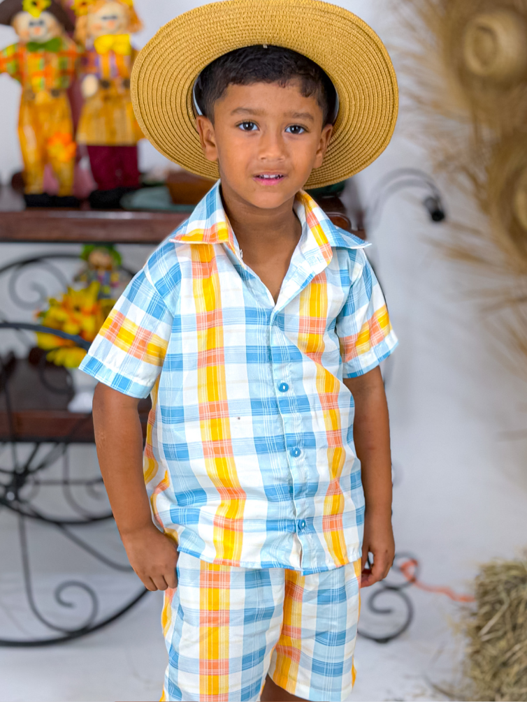 O conjunto masculino infantil junino é perfeito para compor looks tradicionais com muito charme e conforto. O modelo traz um visual típico das festas juninas, com acabamento cuidadoso e detalhes que valorizam a proposta temática.