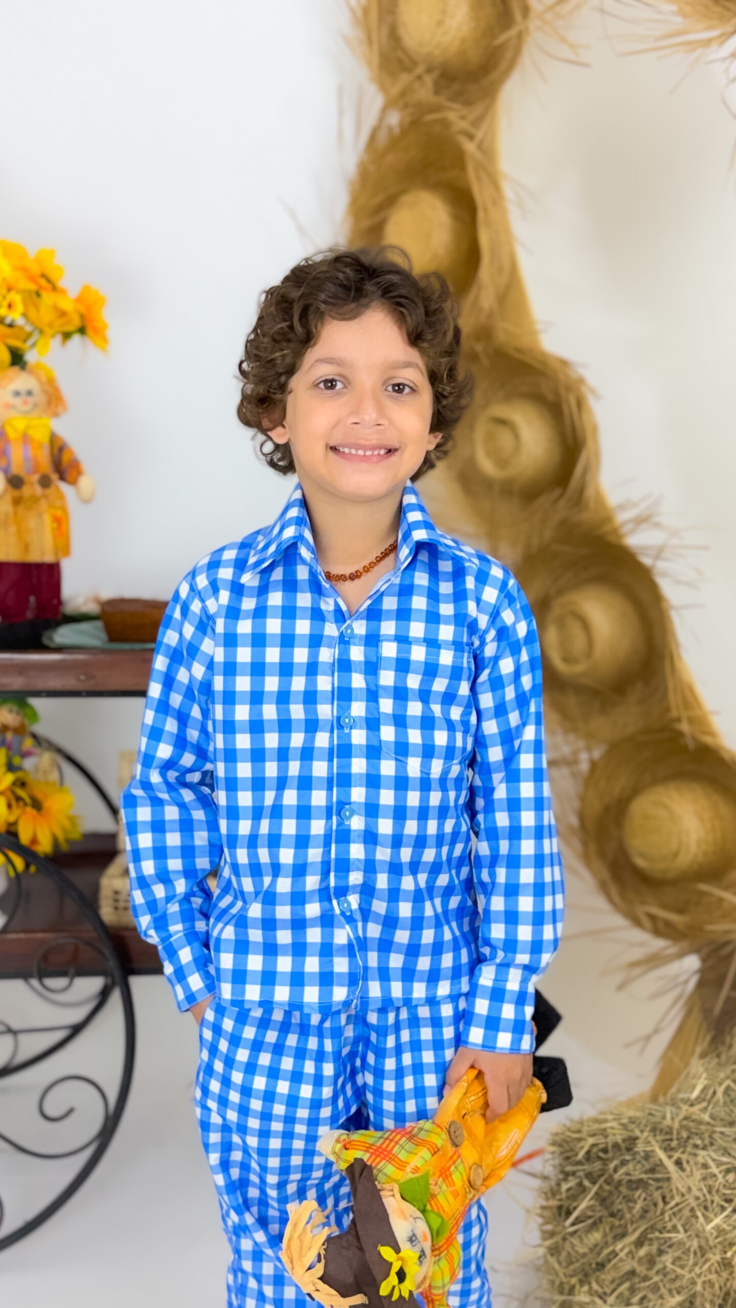 O conjunto masculino infantil junino é perfeito para compor looks tradicionais com muito charme e conforto. O modelo traz um visual típico das festas juninas, com acabamento cuidadoso e detalhes que valorizam a proposta temática.