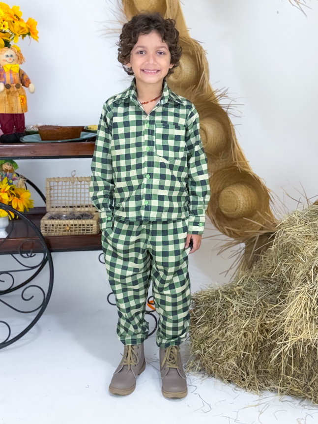 O conjunto masculino infantil junino é perfeito para compor looks tradicionais com muito charme e conforto. O modelo traz um visual típico das festas juninas, com acabamento cuidadoso e detalhes que valorizam a proposta temática.