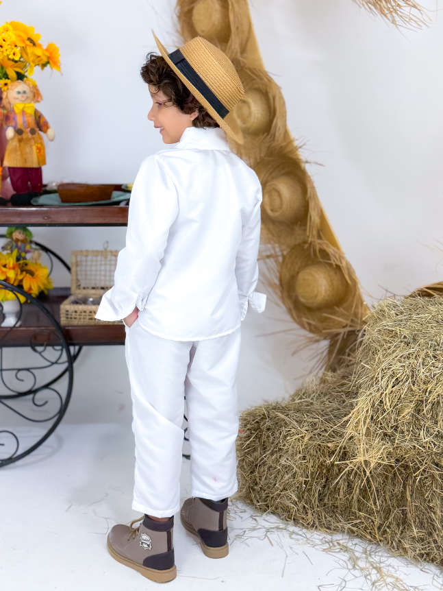 O conjunto masculino infantil junino é perfeito para compor looks tradicionais com muito charme e conforto. O modelo traz um visual típico das festas juninas, com acabamento cuidadoso e detalhes que valorizam a proposta temática.