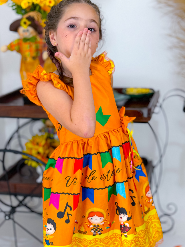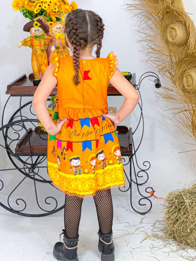 O vestido junino infantil Matutinha é um modelo mais simples e encantador, ideal para quem busca praticidade com um toque tradicional. Sem babados volumosos, apresenta um caimento leve e solto, proporcionando conforto e movimento natural. Conta com detalhes sutis em bico de renda, que trazem delicadeza ao visual sem exageros. O fechamento é feito por botões de pressão na parte de trás, oferecendo facilidade na hora de vestir e um ajuste seguro. Uma opção charmosa e mais básica para as festas juninas, sem perder o estilo característico da ocasião.