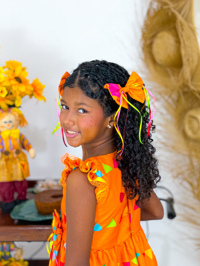 O vestido junino infantil Matutinha é um modelo mais simples e encantador, ideal para quem busca praticidade com um toque tradicional. Sem babados volumosos, apresenta um caimento leve e solto, proporcionando conforto e movimento natural. Conta com detalhes sutis em bico de renda, que trazem delicadeza ao visual sem exageros. O fechamento é feito por botões de pressão na parte de trás, oferecendo facilidade na hora de vestir e um ajuste seguro. Uma opção charmosa e mais básica para as festas juninas, sem perder o estilo característico da ocasião.