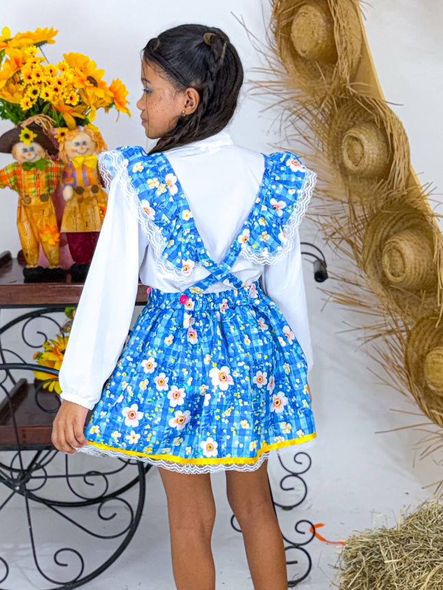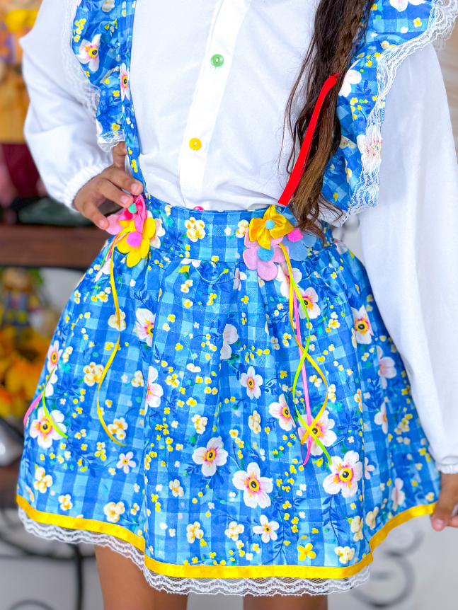A sobreposição adiciona volume e riqueza ao vestido, revelando uma composição vibrante em tons de azul com estampas florais que remetem ao clima alegre das festas juninas. As mangas recebem acabamento rendado, enquanto a barra em camadas com bico de renda e fitas contrastantes reforça o ar artesanal e delicado da peça. O laço lateral e os detalhes coloridos no cabelo completam a proposta lúdica e tradiciona