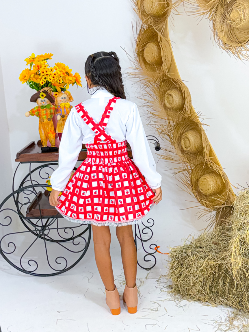 Vestido Junino infantil versátil e cheio de encanto, pensado para transformar o look com um toque de magia. O modelo é composto por um vestido base casual e confortável, que ganha vida ao receber um aplique temático sobreposto, criando instantaneamente o visual festivo. O aplique em tule estampado traz camadas delicadas, acabamento em renda e detalhes em fitas que formam laços charmosos na cintura, valorizando a silhueta com leveza e movimento.