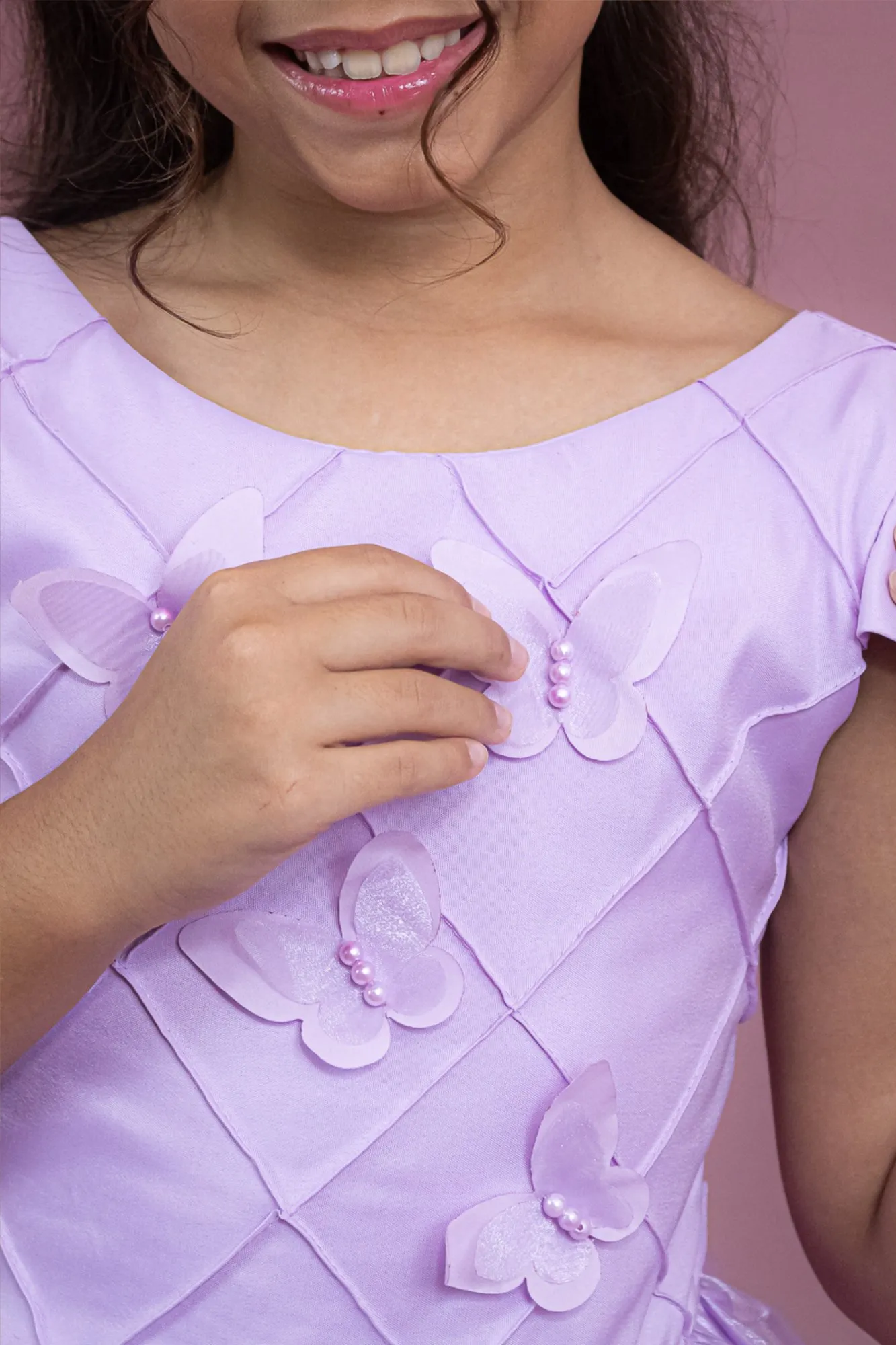 O vestido infantil “Borboleta” é uma opção sofisticada e elegante para festas especiais. O busto apresenta um trabalho delicado em aplicações e costura matelassê, proporcionando um acabamento refinado. As mangas levemente estruturadas adicionam um toque de estilo, enquanto a saia volumosa, composta por camadas, garante movimento e leveza. Esse modelo é ideal para eventos formais, combinando conforto e um visual encantador para a criança.