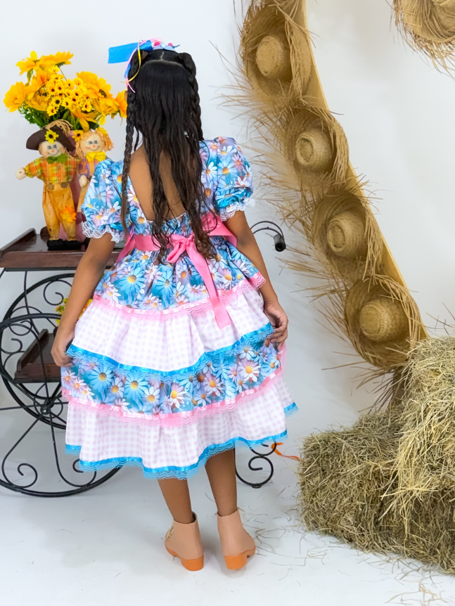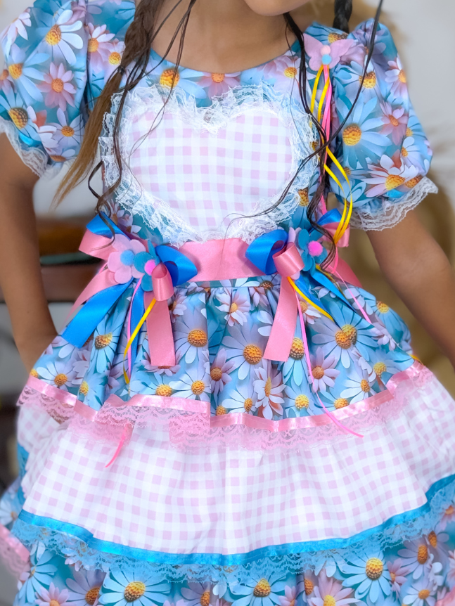 Vestido Junino infantil, um modelo encantador que combina tradição e delicadeza. Desenvolvido com duas estampas harmonizadas, o busto traz um detalhe em formato de coração com acabamento em bico de renda, e o interior desse coração é confeccionado com a estampa secundária da peça em estilo retalho, criando um contraste gracioso e único. A peça possui costas em elastec, proporcionando um ajuste confortável e flexível ao corpo. Conta ainda com dois laços de fita na cintura, além de acabamento em bico de renda nas mangas e nos babados, reforçando o charme artesanal do modelo. Com forro interno, o vestido oferece ótimo caimento e conforto. Ideal para brilhar nas festas juninas com um toque especial de chamego e carinho.