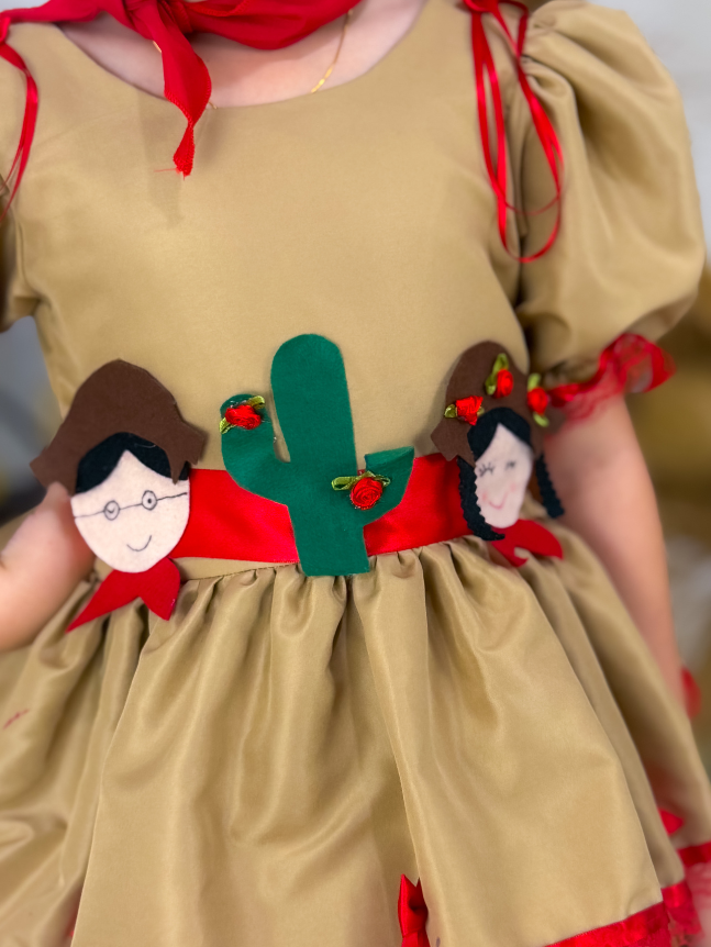Vestido Junino infantil, um modelo encantador que combina tradição e delicadeza. Desenvolvido com duas estampas harmonizadas, o busto traz um detalhe em formato de coração com acabamento em bico de renda, e o interior desse coração é confeccionado com a estampa secundária da peça em estilo retalho, criando um contraste gracioso e único. A peça possui costas em elastec, proporcionando um ajuste confortável e flexível ao corpo. Conta ainda com dois laços de fita na cintura, além de acabamento em bico de renda nas mangas e nos babados, reforçando o charme artesanal do modelo. Com forro interno, o vestido oferece ótimo caimento e conforto. Ideal para brilhar nas festas juninas com um toque especial de chamego e carinho.