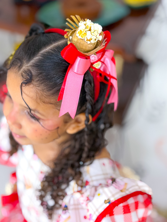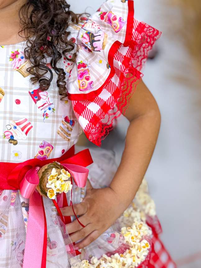 Vestido Junino infantil, um modelo encantador que combina tradição e delicadeza. Desenvolvido com duas estampas harmonizadas, o busto traz um detalhe em formato de coração com acabamento em bico de renda, e o interior desse coração é confeccionado com a estampa secundária da peça em estilo retalho, criando um contraste gracioso e único. A peça possui costas em elastec, proporcionando um ajuste confortável e flexível ao corpo. Conta ainda com dois laços de fita na cintura, além de acabamento em bico de renda nas mangas e nos babados, reforçando o charme artesanal do modelo. Com forro interno, o vestido oferece ótimo caimento e conforto. Ideal para brilhar nas festas juninas com um toque especial de chamego e carinho.