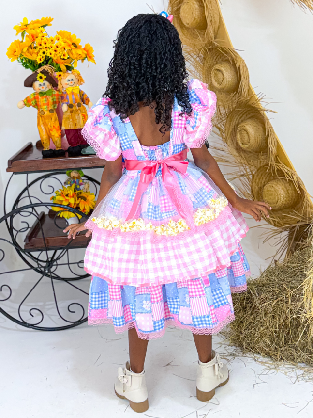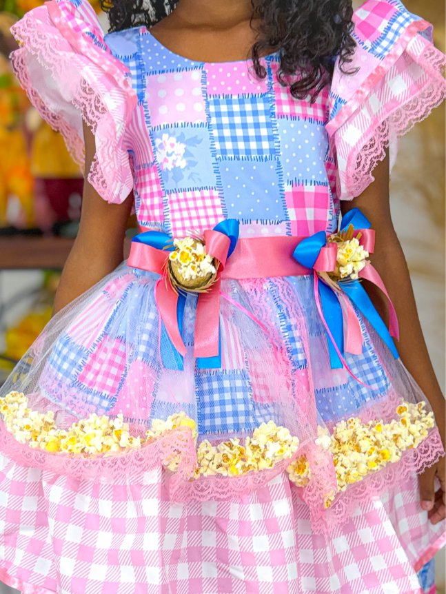 Vestido Junino infantil, um modelo encantador que combina tradição e delicadeza. Desenvolvido com duas estampas harmonizadas, o busto traz um detalhe em formato de coração com acabamento em bico de renda, e o interior desse coração é confeccionado com a estampa secundária da peça em estilo retalho, criando um contraste gracioso e único. A peça possui costas em elastec, proporcionando um ajuste confortável e flexível ao corpo. Conta ainda com dois laços de fita na cintura, além de acabamento em bico de renda nas mangas e nos babados, reforçando o charme artesanal do modelo. Com forro interno, o vestido oferece ótimo caimento e conforto. Ideal para brilhar nas festas juninas com um toque especial de chamego e carinho.