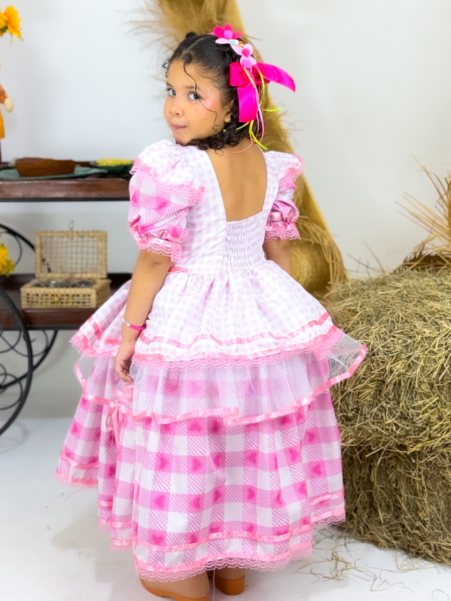 Vestido Junino infantil, um modelo encantador que combina tradição e delicadeza. Desenvolvido com duas estampas harmonizadas, o busto traz um detalhe em formato de coração com acabamento em bico de renda, e o interior desse coração é confeccionado com a estampa secundária da peça em estilo retalho, criando um contraste gracioso e único. A peça possui costas em elastec, proporcionando um ajuste confortável e flexível ao corpo. Conta ainda com dois laços de fita na cintura, além de acabamento em bico de renda nas mangas e nos babados, reforçando o charme artesanal do modelo. Com forro interno, o vestido oferece ótimo caimento e conforto. Ideal para brilhar nas festas juninas com um toque especial de chamego e carinho.